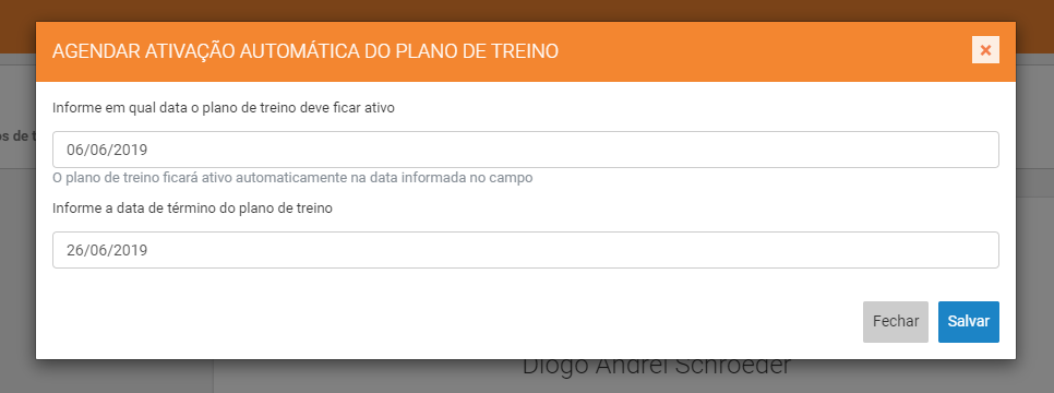 Agora é possível agendar treinos para os alunos. Ou seja, a ativação do plano de treino será feita automaticamente na data informada. Para realizar isso, basta abrir as opções do Plano de treino do aluno e clicar em Agendar ativação do plano. Feito isso, só é preciso informar a data em que o plano ficará ativo e também qual a data de vencimento dele.