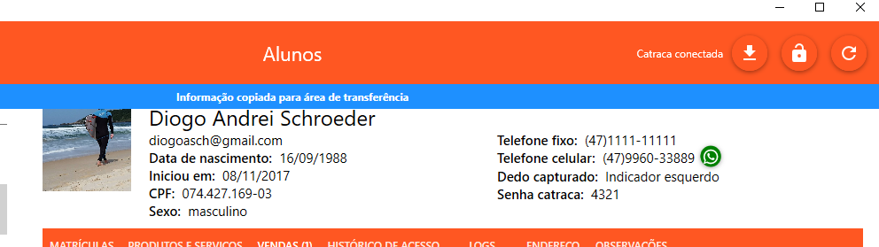 Agora é possível copiar informações de alunos e colaboradores, basta clicar sobre elas no perfil. Após clicar, a informação ficará disponível na Área de transferência (CTRL + V).