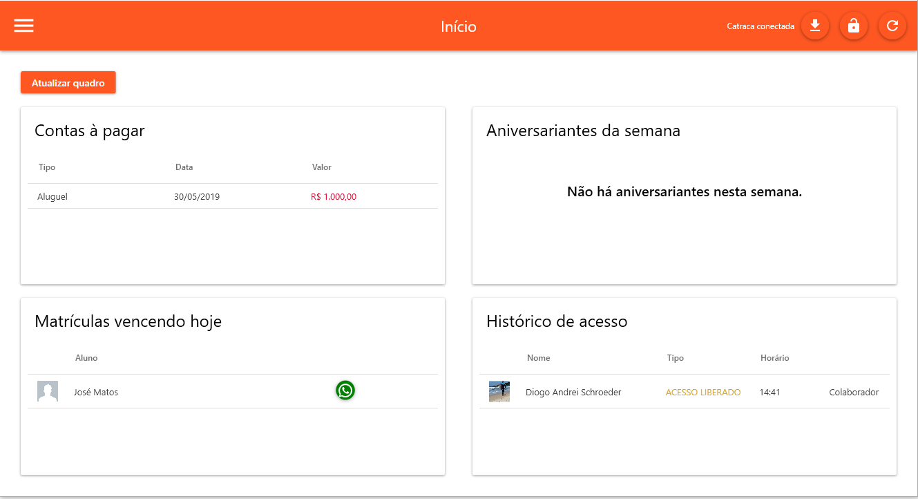 Foi adicionado uma visualização chamada Início onde apresentamos algumas informações como Contas à pagar, Aniversariantes da semana, Matrículas vencendo no dia e Histórico de acesso.