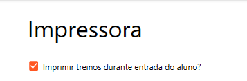Nesta versão ficou disponível a opção para imprimir treinos do aluno durante o acesso pela catraca. Para que esta funcionalidade funcione é necessário ativar nas configurações, marcando a opção Imprimir treinos durante entrada do aluno e depois clicando em Salvar para ativar. É necessário também no Plano de treino do aluno marcar que ele será impresso durante a entrada, isso é feito na tela de criação do plano no campo Imprimir treino durante acesso. A impressão ocorre 1x ao dia e se o aluno já treinou através do app ou pelo autoatendimento naquele dia ele não será impresso. Os treinos são impressos na ordem em que eles estão no plano de treino.