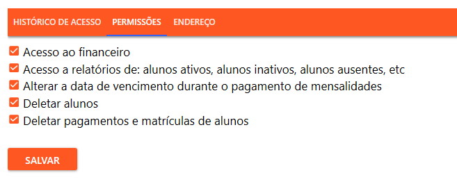 Agora é possível escolher as permissões dos colaboradores. Com a conta de administrador durante o cadastro do colaborador ou no perfil do colaborador na aba Permissões é possível escolher quais permissões ele terá. São elas: Acesso ao financeiro, acesso a relatórios (alunos ativos, inativos, ausentes, etc), alterar data de vencimentos nos pagamentos, deletar matrículas/pagamentos e deletar alunos